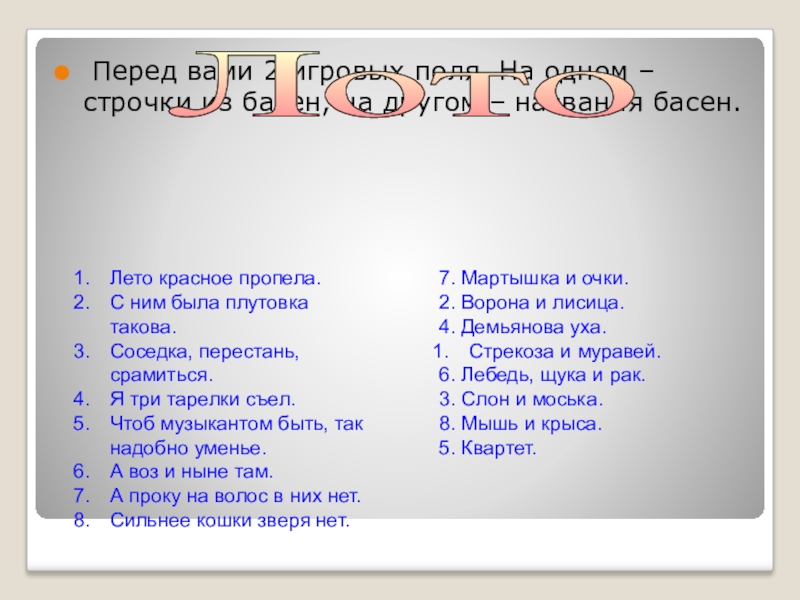 басен, на другом – названия басен.