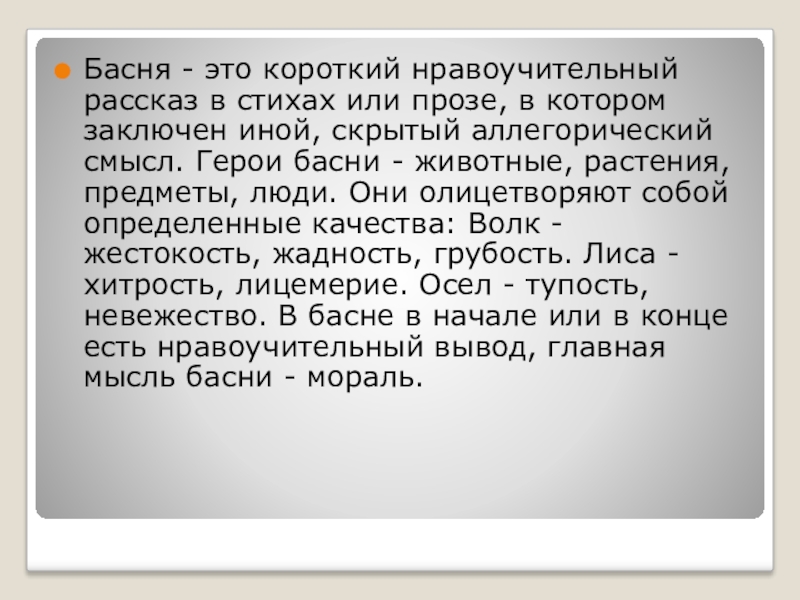 котором заключен иной, скрытый аллегорический смысл. Герои басни - животные, растения, предметы, люди. Они олицетворяют собой определенные качества: Волк - жестокость, жадность, грубость. Лиса - хитрость, лицемерие. Осел - тупость, невежество. В басне в начале или в конце есть нравоучительный вывод, главная мысль басни - мораль.