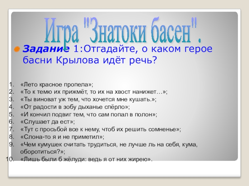 Задание 1:Отгадайте, о каком герое басни Крылова идёт речь?