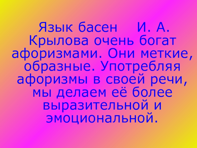 Слайд 27 Язык басен И. А. Крылова очень богат афоризмами. Они