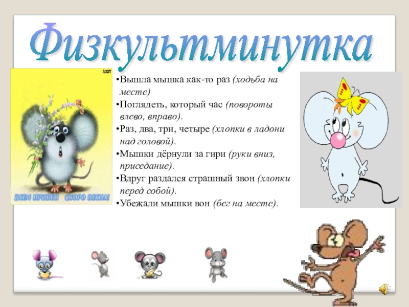 Убежали мышки вон (бег на месте).