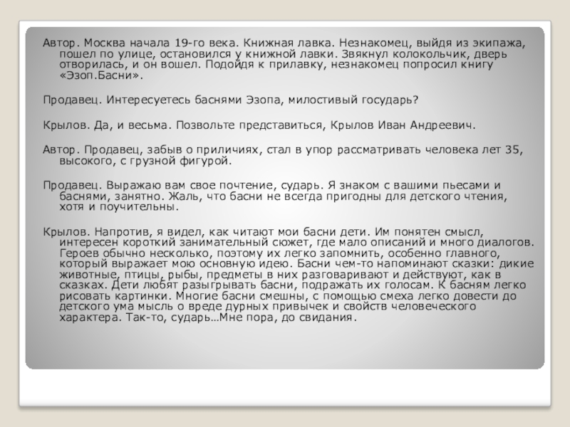 Крылов. Напротив, я видел, как читают мои басни дети. Им понятен смысл, интересен короткий занимательный сюжет, где мало описаний и много диалогов. Героев обычно несколько, поэтому их легко запомнить, особенно главного, который выражает мою основную идею. Басни чем-то напоминают сказки: дикие животные, птицы, рыбы, предметы в них разговаривают и действуют, как в сказках. Дети любят разыгрывать басни, подражать их голосам. К басням легко рисовать картинки. Многие басни смешны, с помощью смеха легко довести до детского ума мысль о вреде дурных привычек и свойств человеческого характера. Так-то, сударь…Мне пора, до свидания.