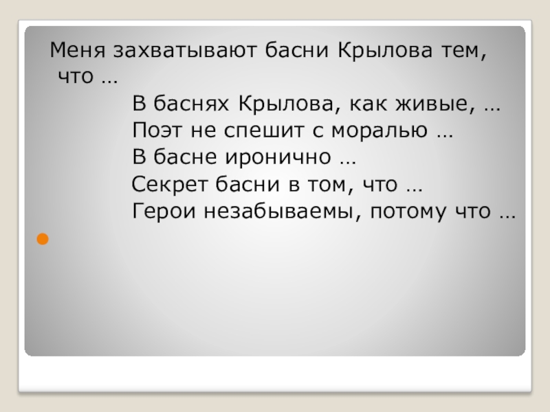 Меня захватывают басни Крылова тем, что …