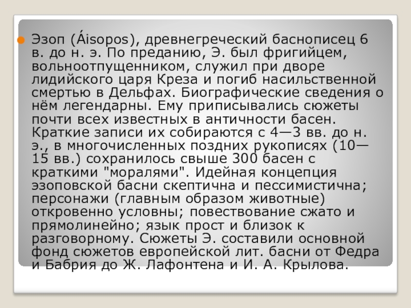 Э. был фригийцем, вольноотпущенником, служил при дворе лидийского царя Креза и погиб насильственной смертью в Дельфах. Биографические сведения о нём легендарны. Ему приписывались сюжеты почти всех известных в античности басен. Краткие записи их собираются с 4—3 вв. до н. э., в многочисленных поздних рукописях (10— 15 вв.) сохранилось свыше 300 басен с краткими "моралями". Идейная концепция эзоповской басни скептична и пессимистична; персонажи (главным образом животные) откровенно условны; повествование сжато и прямолинейно; язык прост и близок к разговорному. Сюжеты Э. составили основной фонд сюжетов европейской лит. басни от Федра и Бабрия до Ж. Лафонтена и И. А. Крылова.