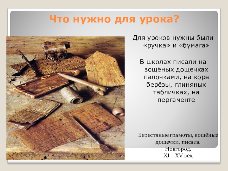 Берестяные грамоты, вощёные дощечки, писала.
