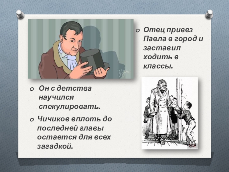 Отец привез Павла в город и заставил ходить в классы.Чичиков вплоть до последней главы остается для всех