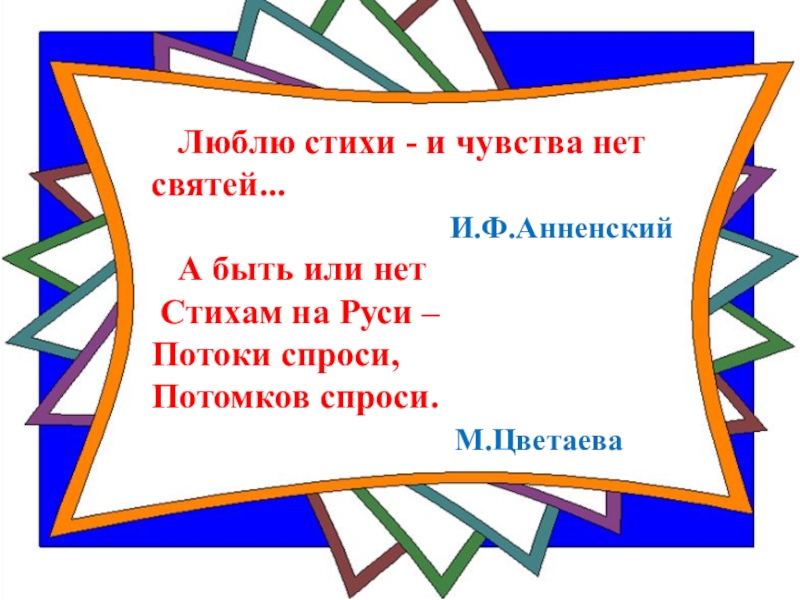 Люблю стихи - и чувства нет святей... И.Ф.Анненский А быть или нет Стихам на Руси – Потоки спроси, Потомков спроси.
