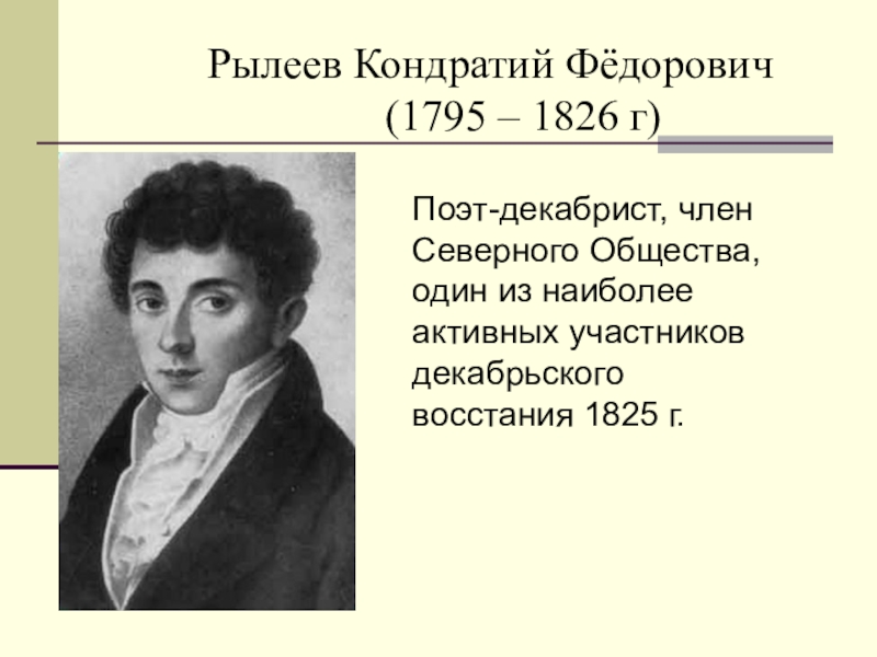 Рылеев Кондратий Фёдорович   (1795 – 1826 г)Поэт-декабрист, член Северного Общества, один из наиболее активных участников