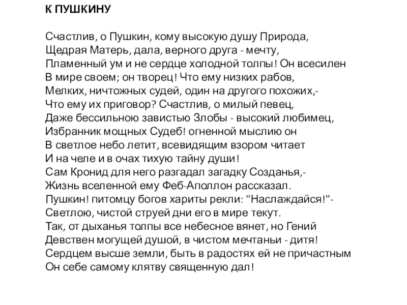 Счастлив, о Пушкин, кому высокую душу Природа,