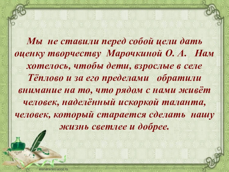 Слайд 20Мы не ставили перед собой цели дать оценку творчеству Марочкиной О.
