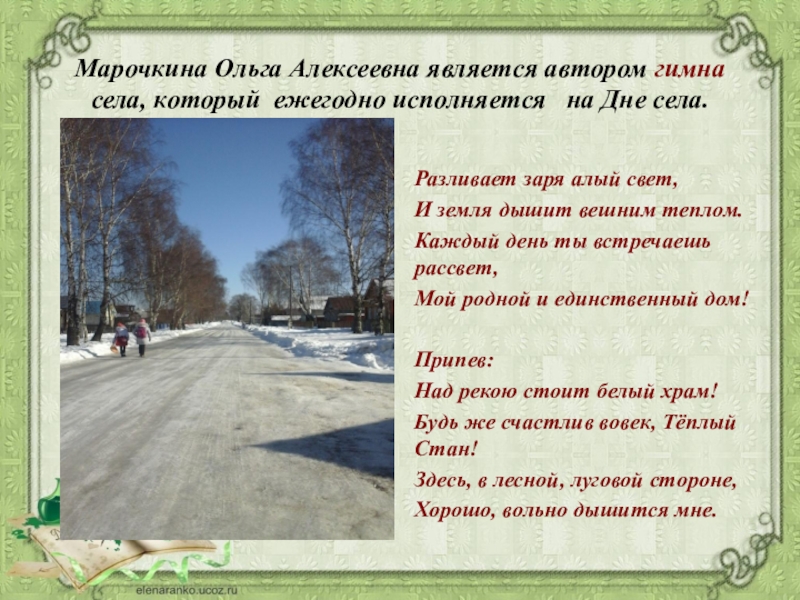 Слайд 11Марочкина Ольга Алексеевна является автором гимна села, который ежегодно исполняется