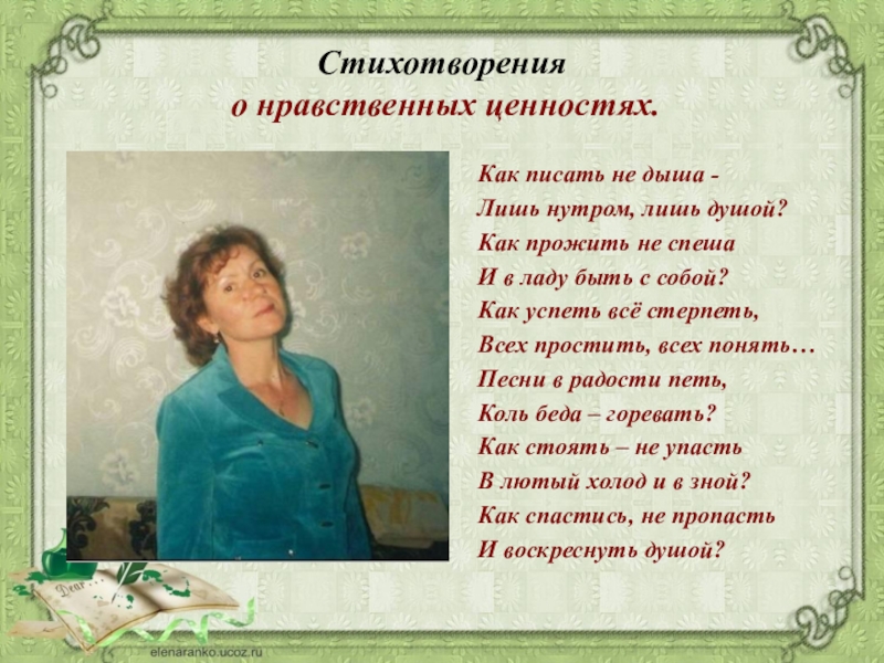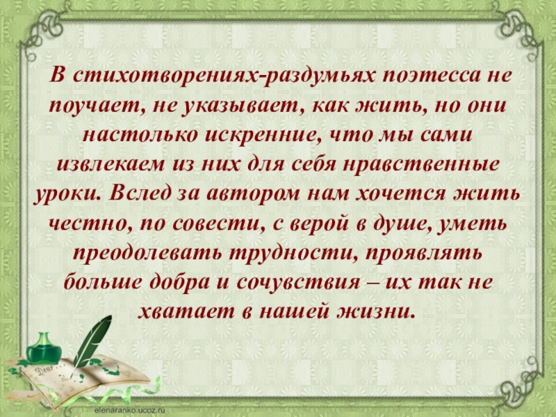 Слайд 15 В стихотворениях-раздумьях поэтесса не поучает, не указывает, как жить, но