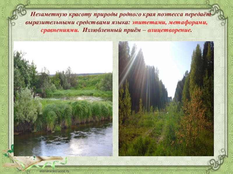 Слайд 13 Незаметную красоту природы родного края поэтесса передаёт выразительными