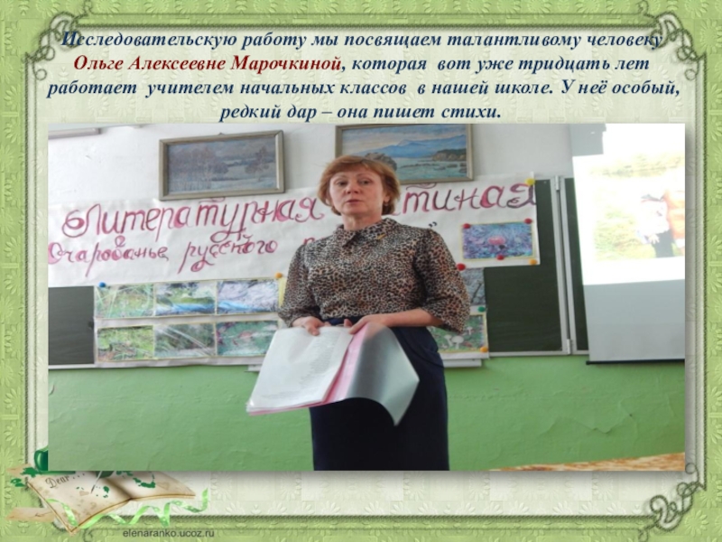 Слайд 2Исследовательскую работу мы посвящаем талантливому человеку Ольге Алексеевне Марочкиной, которая вот