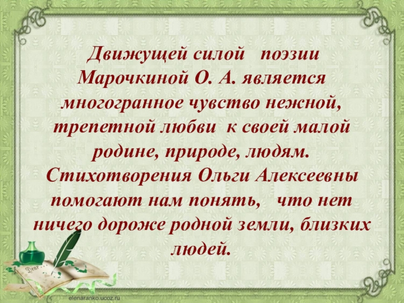 Слайд 19 Движущей силой поэзии Марочкиной О. А. является многогранное чувство