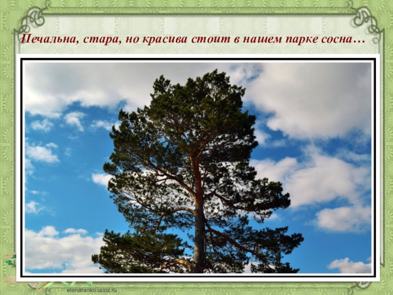 Слайд 9Печальна, стара, но красива стоит в нашем парке сосна…