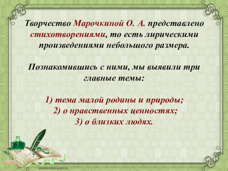 Слайд 5Творчество Марочкиной О. А. представлено стихотворениями, то есть лирическими произведениями небольшого