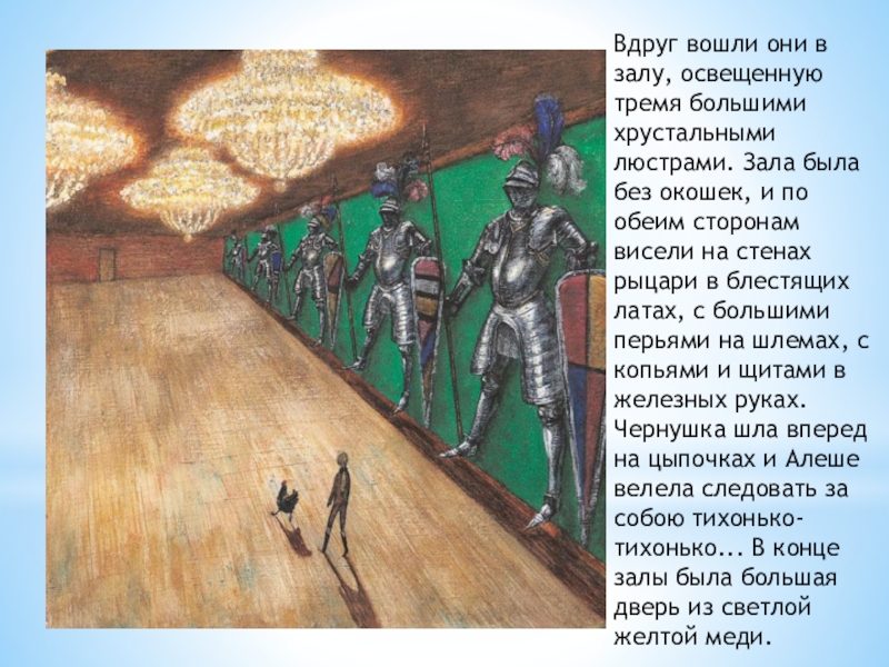 была без окошек, и по обеим сторонам висели на стенах рыцари в блестящих латах, с большими перьями на шлемах, с копьями и щитами в железных руках. Чернушка шла вперед на цыпочках и Алеше велела следовать за собою тихонько-тихонько... В конце залы была большая дверь из светлой желтой меди.
