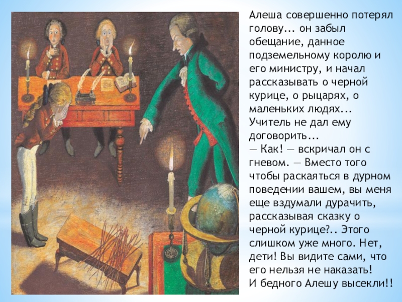 Слайд 19Алеша совершенно потерял голову... он забыл обещание, данное подземельному королю и
