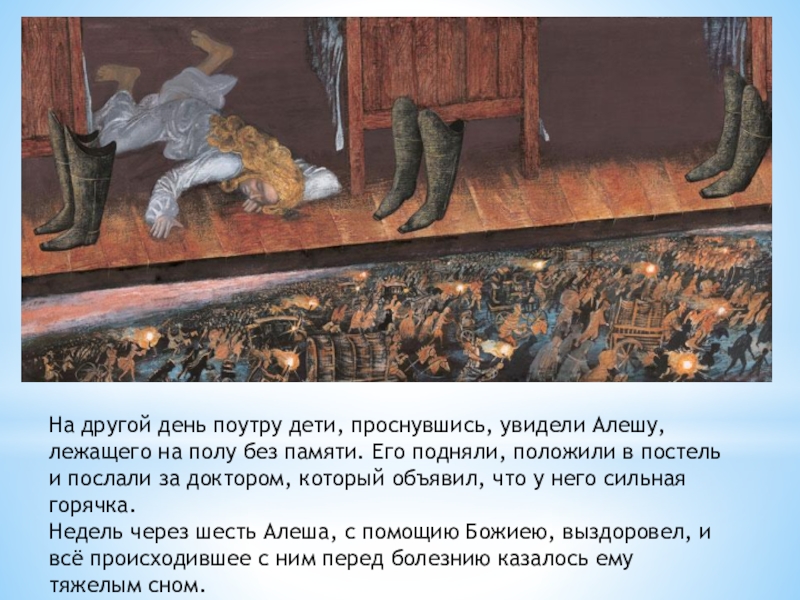 Слайд 20На другой день поутру дети, проснувшись, увидели Алешу, лежащего на полу