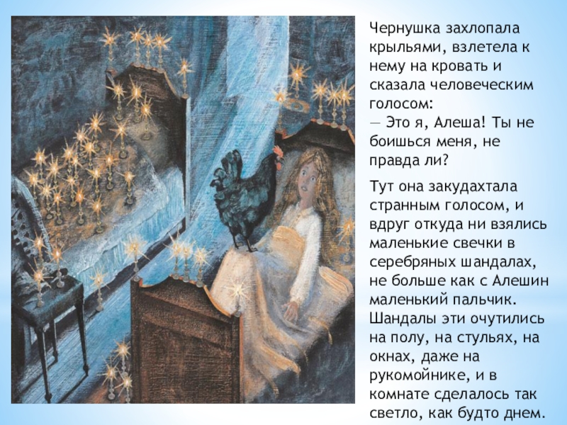 Слайд 6Чернушка захлопала крыльями, взлетела к нему на кровать и сказала человеческим