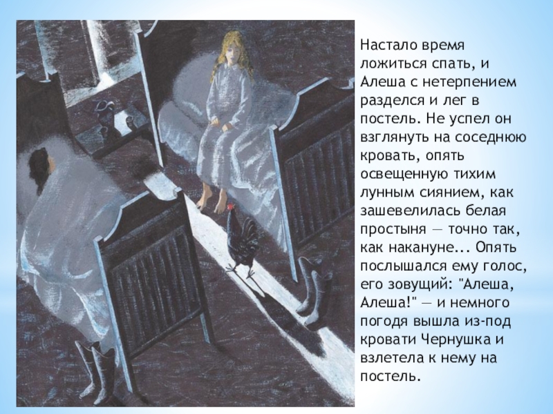 и лег в постель. Не успел он взглянуть на соседнюю кровать, опять освещенную тихим лунным сиянием, как зашевелилась белая простыня — точно так, как накануне... Опять послышался ему голос, его зовущий: "Алеша, Алеша!" — и немного погодя вышла из-под кровати Чернушка и взлетела к нему на постель.