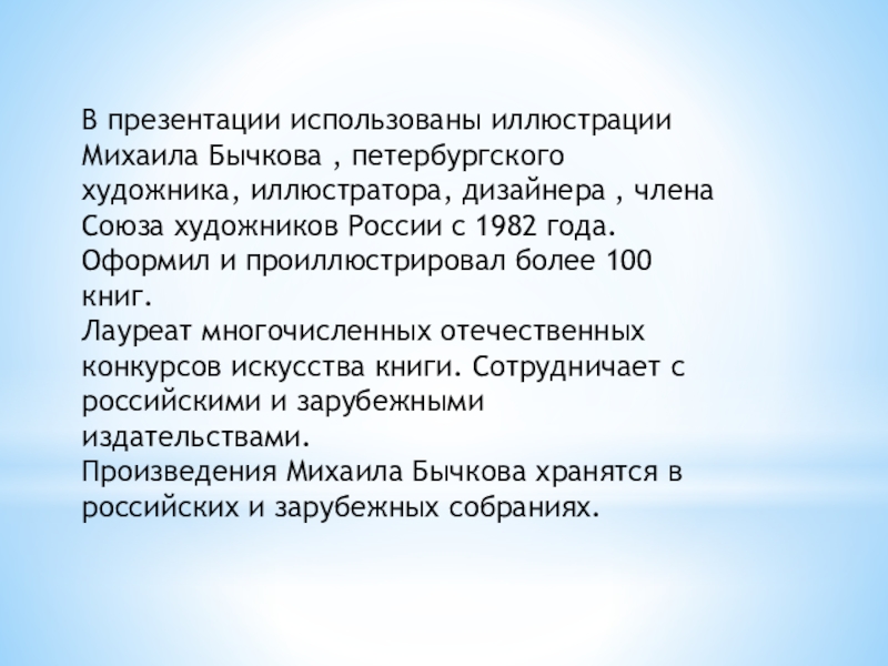 В презентации использованы иллюстрации Михаила Бычкова , петербургского художника, иллюстратора, дизайнера