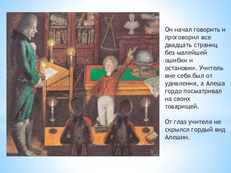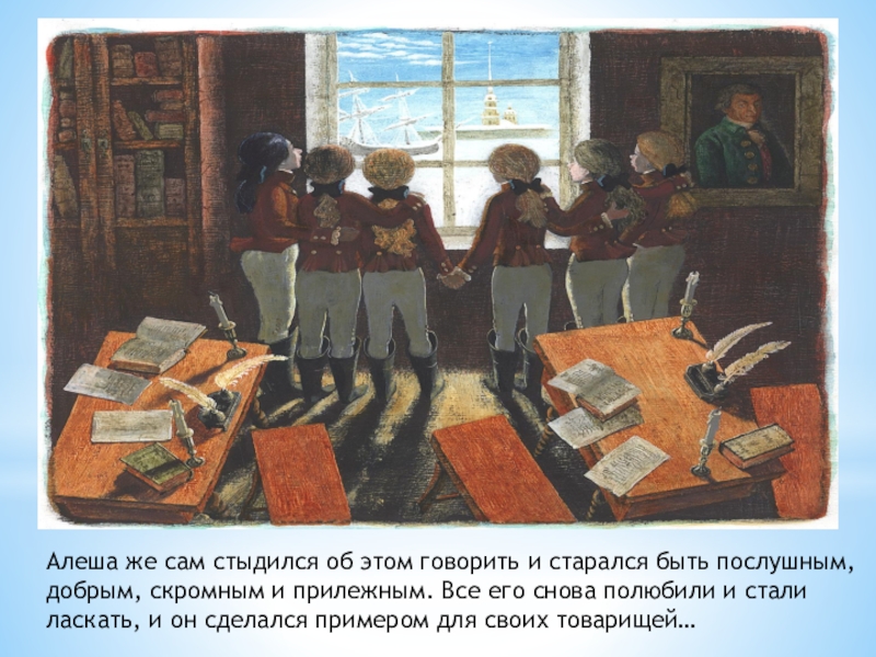 Слайд 21Алеша же сам стыдился об этом говорить и старался быть послушным,