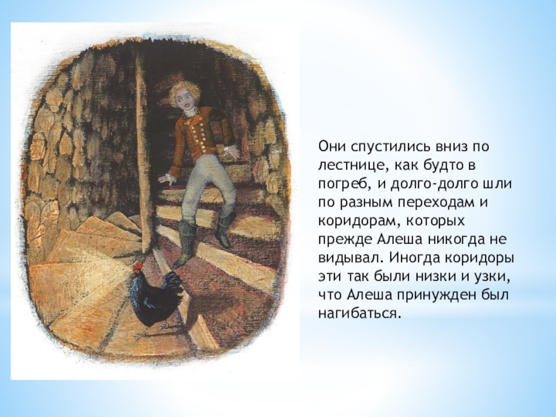 Слайд 9Они спустились вниз по лестнице, как будто в погреб, и долго-долго