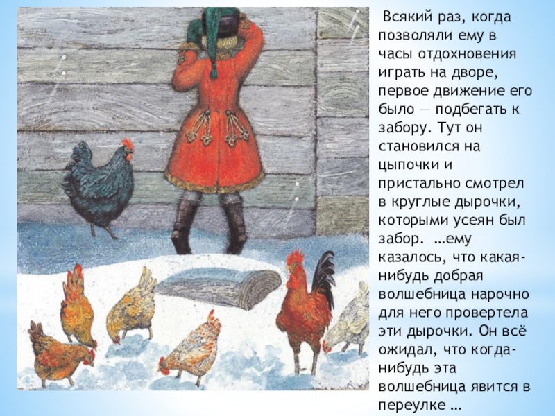 дворе, первое движение его было — подбегать к забору. Тут он становился на цыпочки и пристально смотрел в круглые дырочки, которыми усеян был забор. …ему казалось, что какая-нибудь добрая волшебница нарочно для него провертела эти дырочки. Он всё ожидал, что когда-нибудь эта волшебница явится в переулке …