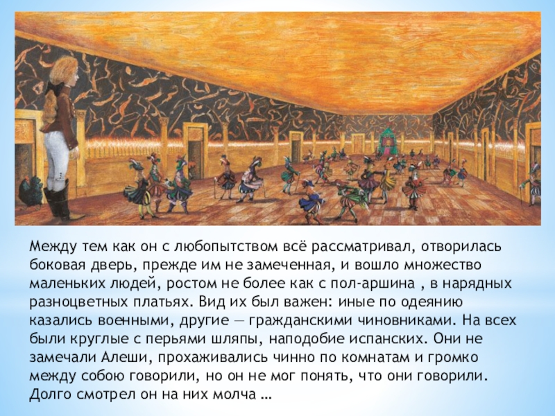 прежде им не замеченная, и вошло множество маленьких людей, ростом не более как с пол-аршина , в нарядных разноцветных платьях. Вид их был важен: иные по одеянию казались военными, другие — гражданскими чиновниками. На всех были круглые с перьями шляпы, наподобие испанских. Они не замечали Алеши, прохаживались чинно по комнатам и громко между собою говорили, но он не мог понять, что они говорили. Долго смотрел он на них молча …
