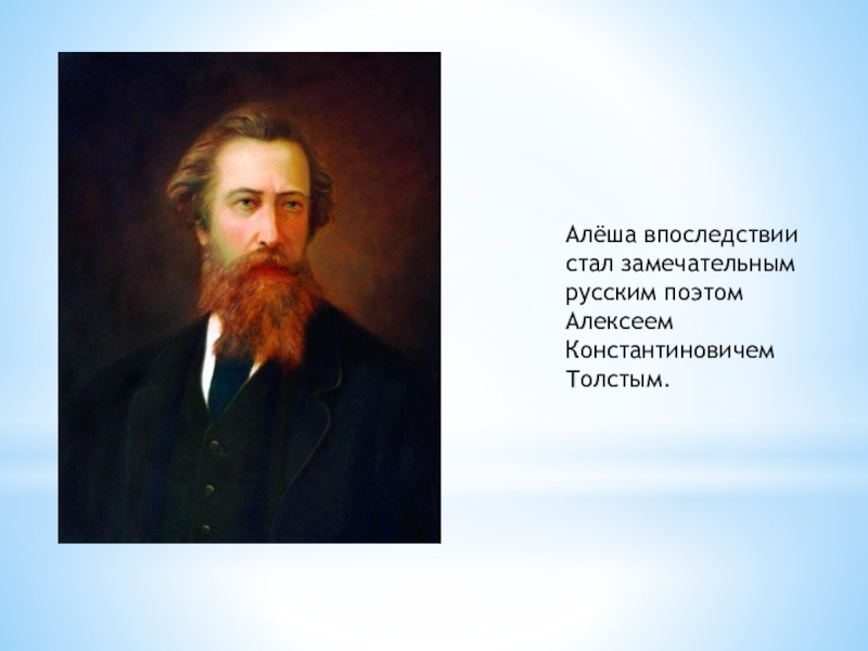 Слайд 3Алёша впоследствии стал замечательным русским поэтом Алексеем Константиновичем Толстым.