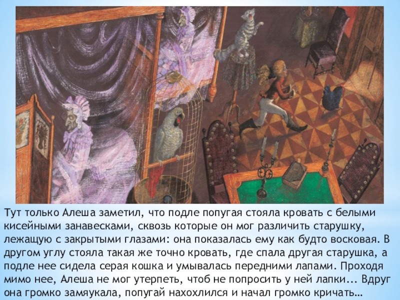 Слайд 8Тут только Алеша заметил, что подле попугая стояла кровать с белыми