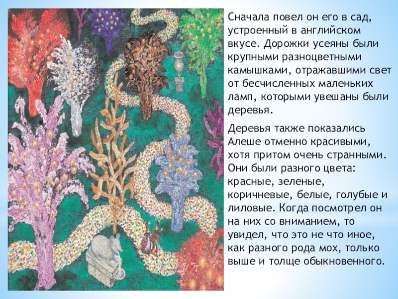 Деревья также показались Алеше отменно красивыми, хотя притом очень странными. Они были разного цвета: красные, зеленые, коричневые, белые, голубые и лиловые. Когда посмотрел он на них со вниманием, то увидел, что это не что иное, как разного рода мох, только выше и толще обыкновенного.