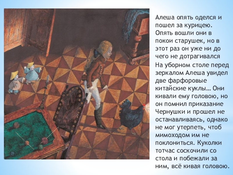Слайд 13Алеша опять оделся и пошел за курицею. Опять вошли они в