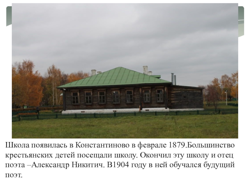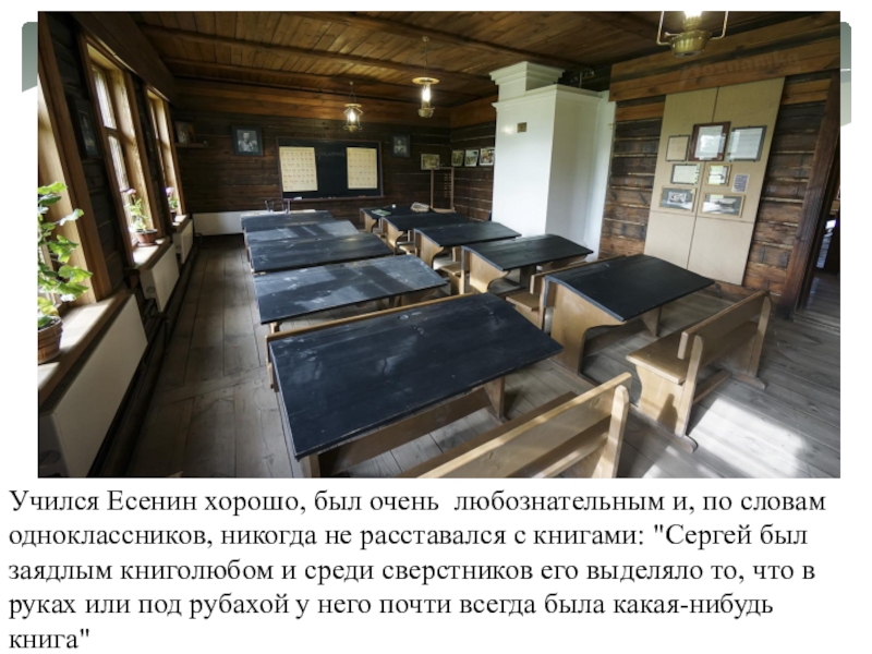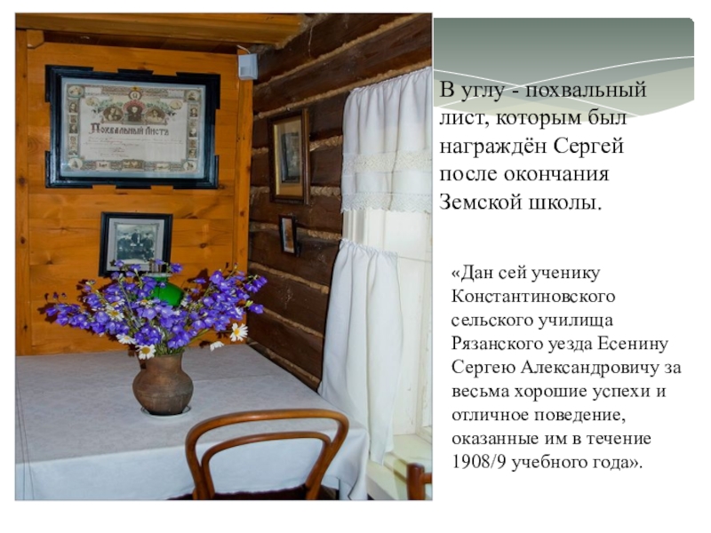 «Дан сей ученику Константиновского сельского училища Рязанского уезда Есенину Сергею Александровичу за весьма хорошие успехи и отличное поведение, оказанные им в течение 1908/9 учебного года».