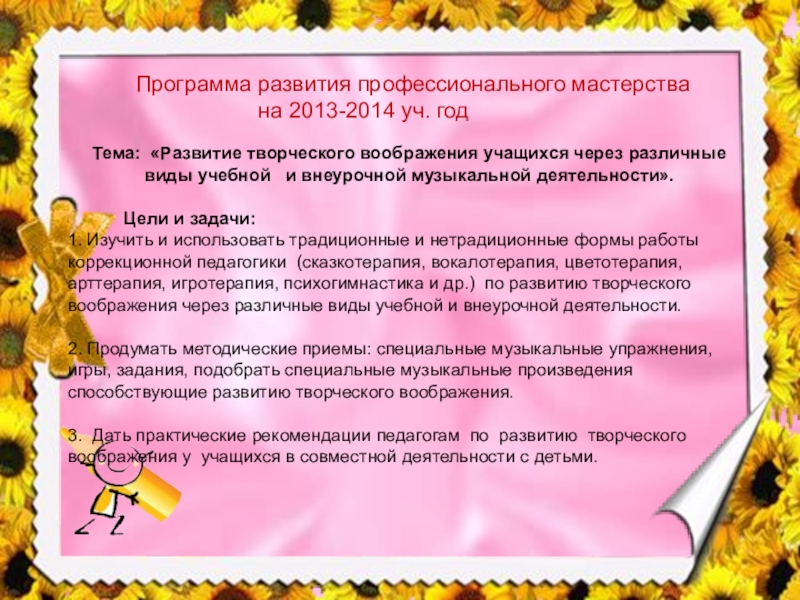1. Изучить и использовать традиционные и нетрадиционные формы работы коррекционной педагогики (сказкотерапия, вокалотерапия, цветотерапия, арттерапия, игротерапия, психогимнастика и др.) по развитию творческого воображения через различные виды учебной и внеурочной деятельности.