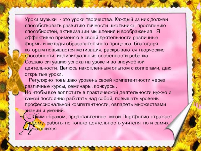 К своей работе стараюсь подойти творчески и с любовью. Профессия учителя музыки мне нравится тем, что учитель может импровизировать, творить, быть артистом и исполнителем. И, конечно же, только в школе, по моему мнению, можно более качественно обучить детей слушать музыкальные произведения не только современных исполнителей, но и мировых классиков золотого фонда всего музыкального наследия, анализировать творчество композиторов классиков, современных композиторов и исполнителей. На уроках музыки обучающиеся знакомятся с воздействием музыки на чувства, мысли, настроения человека его внутренний мир, духовные стороны. Через познание жизни выдающихся людей обучающиеся учатся анализировать свои эмоциональные состояния.