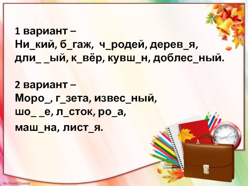 1 вариант – Ни_кий, б_гаж, ч_родей, дерев_я, дли_ _ый, к_вёр, кувш_н, доблес_ный.  2 вариант –