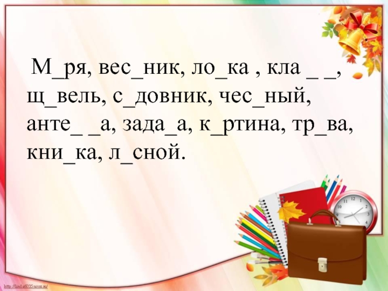 Слайд 7 М_ря, вес_ник, ло_ка , кла _ _, щ_вель, с_довник, чес_ный, анте_