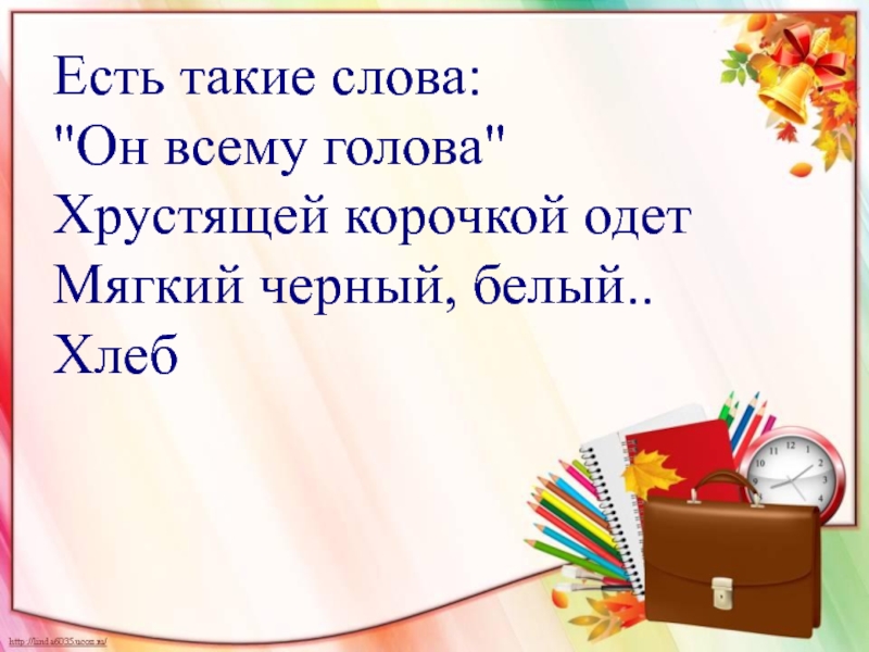 Есть такие слова: "Он всему голова" Хрустящей корочкой одет Мягкий черный, белый..Хлеб