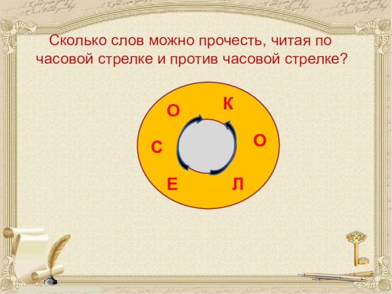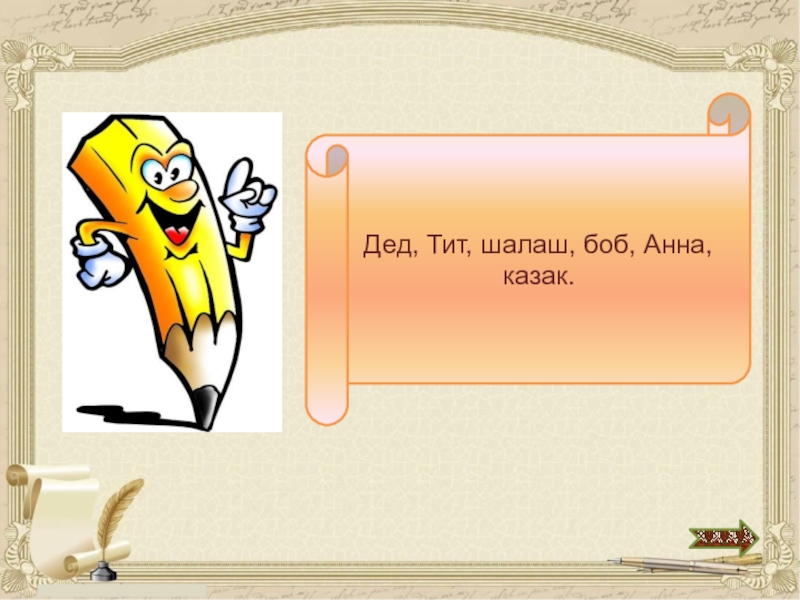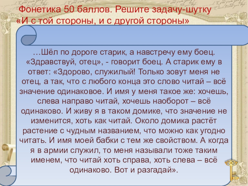 …Шёл по дороге старик, а навстречу ему боец. «Здравствуй, отец», - говорит боец. А старик ему в ответ: «Здорово, служилый! Только зовут меня не отец, а так, что с любого конца это слово читай – всё значение одинаковое. И имя у меня такое же: хочешь, слева направо читай, хочешь наоборот – всё одинаково. И живу я в таком домике, что значение не изменится, хоть как читай. Около домика растёт растение с чудным названием, что можно как угодно читать. И имя моей бабки с тем же свойством. А когда я в армии служил, то меня называли тоже таким именем, что читай хоть справа, хоть слева – всё одинаково. Вот и разгадай».