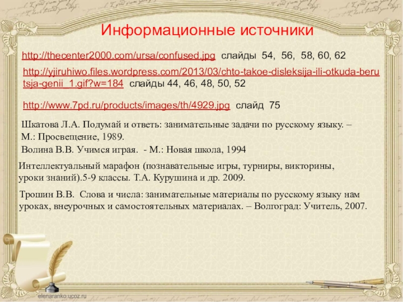 Трошин В.В. Слова и числа: занимательные материалы по русскому языку нам уроках, внеурочных и самостоятельных материалах. – Волгоград: Учитель, 2007.