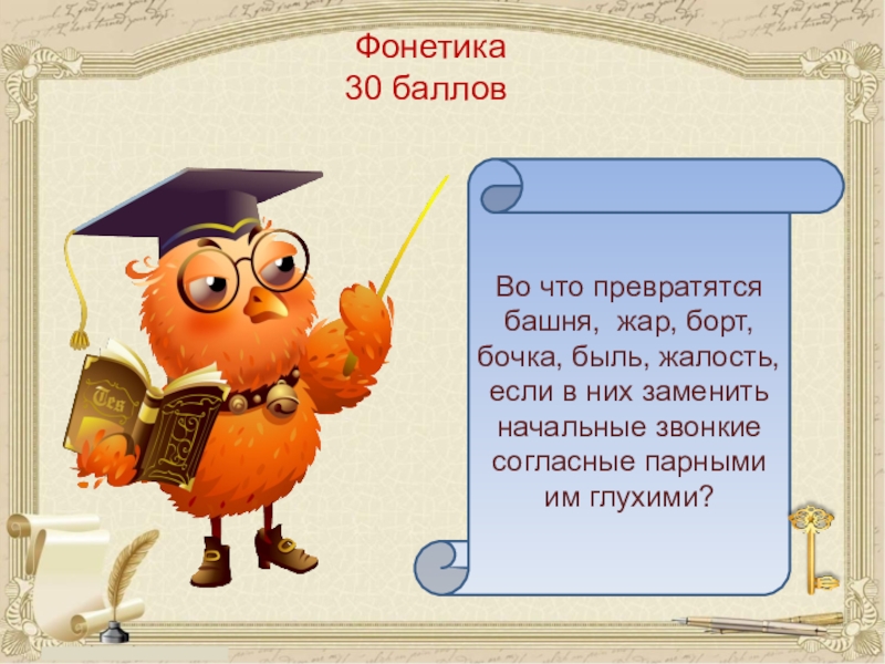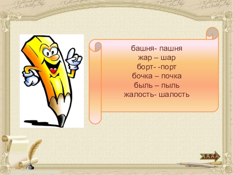 Во что превратятся башня, жар, борт, бочка, быль, жалость, если в них заменить начальные звонкие согласные парными им глухими?