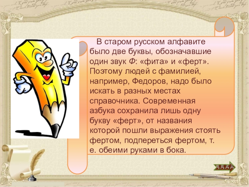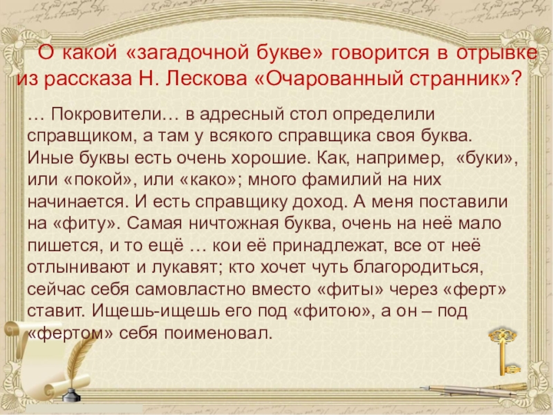 … Покровители… в адресный стол определили справщиком, а там у всякого справщика своя буква. Иные буквы есть очень хорошие. Как, например, «буки», или «покой», или «како»; много фамилий на них начинается. И есть справщику доход. А меня поставили на «фиту». Самая ничтожная буква, очень на неё мало пишется, и то ещё … кои её принадлежат, все от неё отлынивают и лукавят; кто хочет чуть благородиться, сейчас себя самовластно вместо «фиты» через «ферт» ставит. Ищешь-ищешь его под «фитою», а он – под «фертом» себя поименовал.