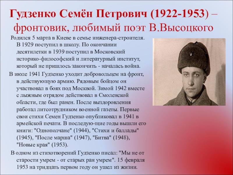 Слайд 11Гудзенко Семён Петрович (1922-1953) – фронтовик, любимый поэт В.Высоцкого