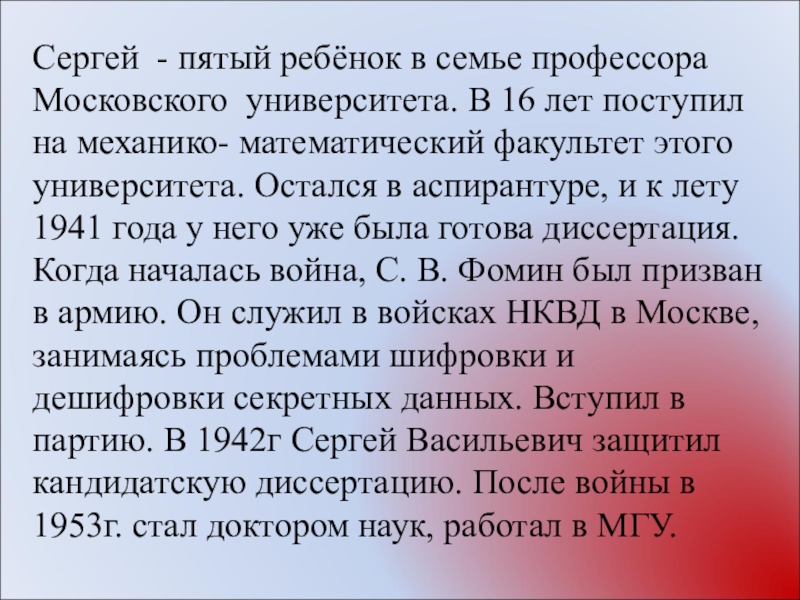 лет поступил на механико- математический факультет этого университета. Остался в аспирантуре, и к лету 1941 года у него уже была готова диссертация. Когда началась война, С. В. Фомин был призван в армию. Он служил в войсках НКВД в Москве, занимаясь проблемами шифровки и дешифровки секретных данных. Вступил в партию. В 1942г Сергей Васильевич защитил кандидатскую диссертацию. После войны в 1953г. стал доктором наук, работал в МГУ.