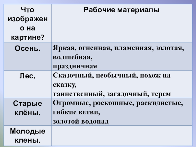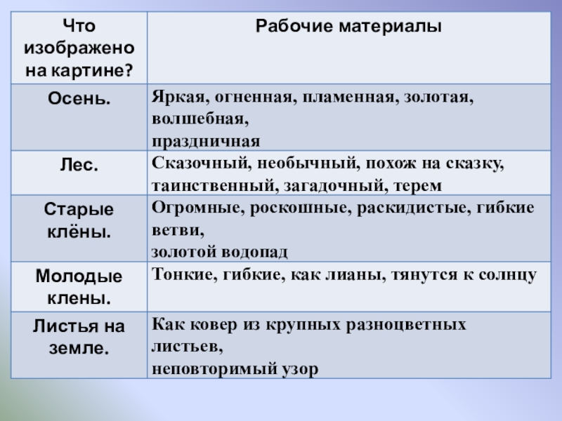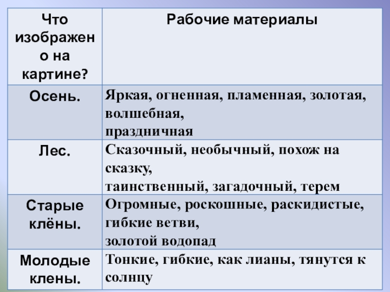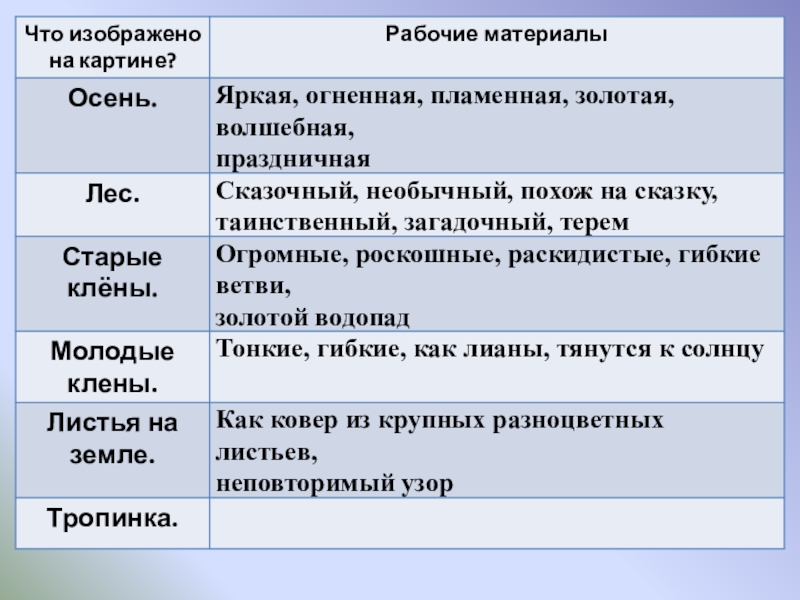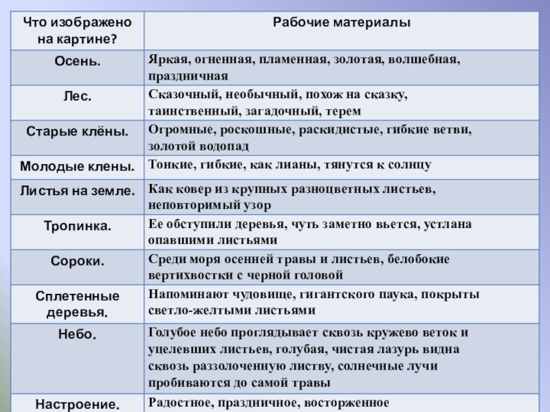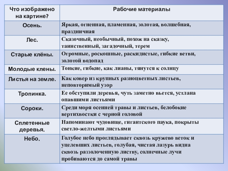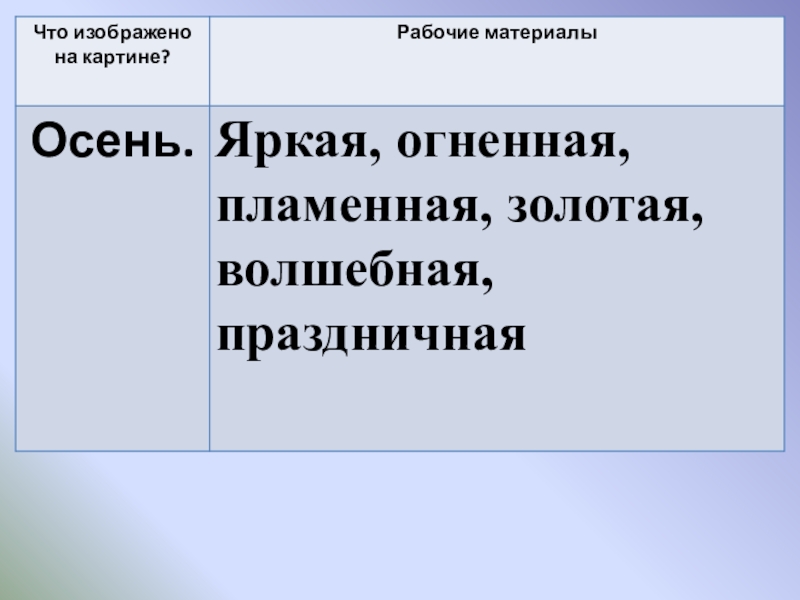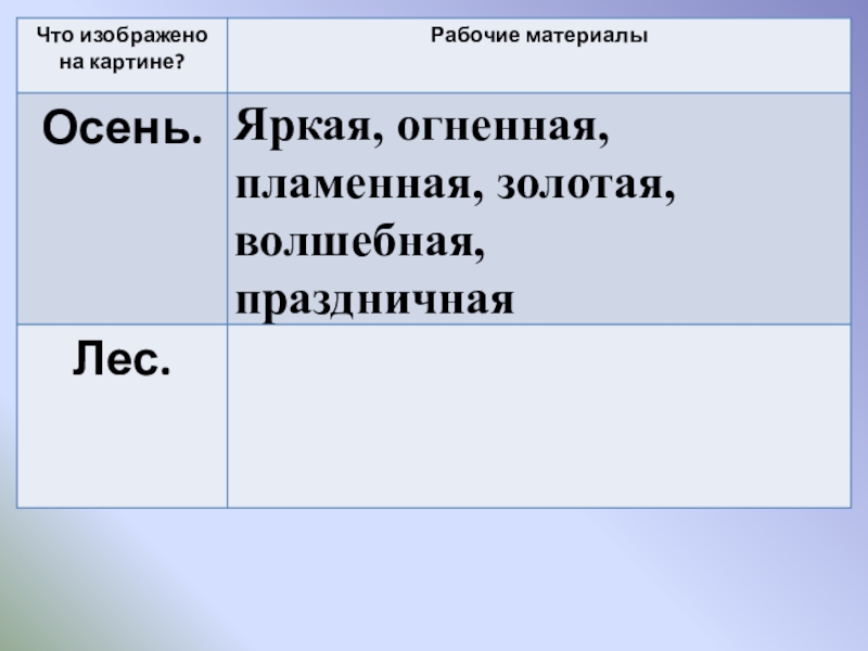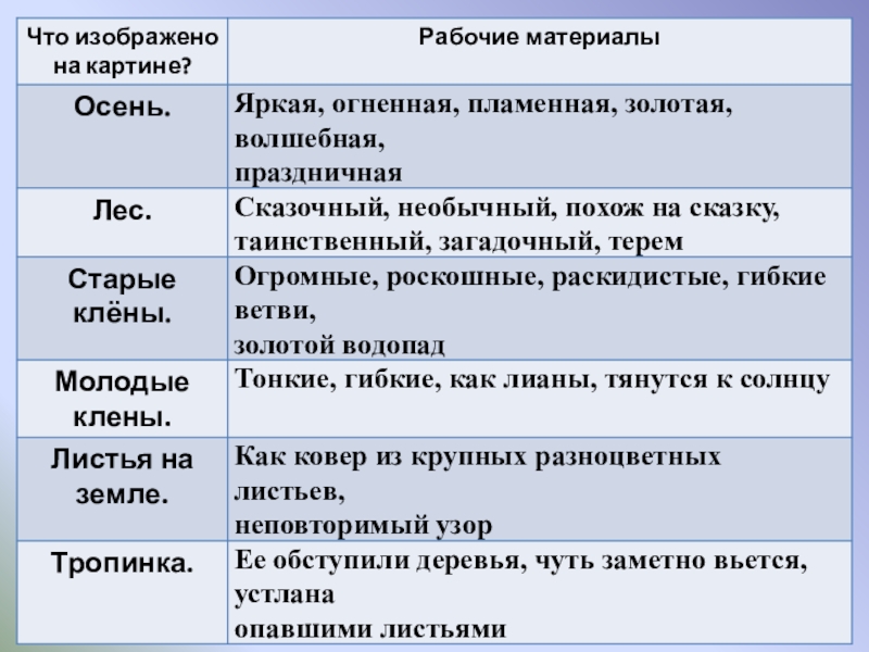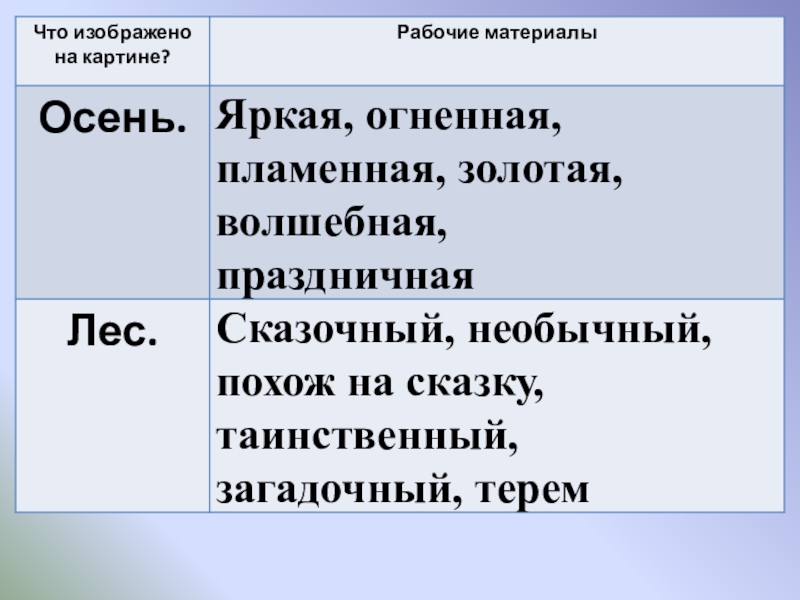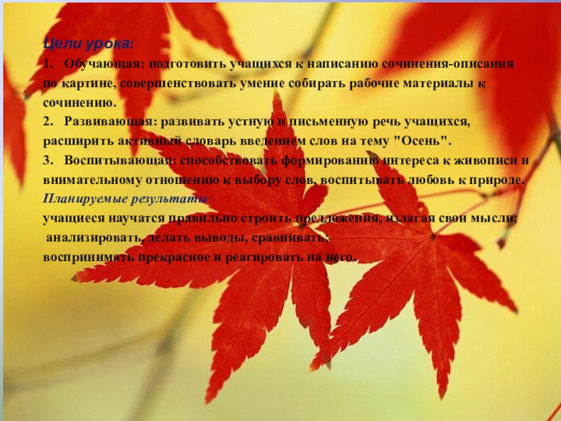 собирать рабочие материалы к сочинению.  2.   Развивающая: развивать устную и письменную речь учащихся, расширить активный словарь введением слов на тему "Осень".  3.   Воспитывающая: способствовать формированию интереса к живописи и внимательному отношению к выбору слов, воспитывать любовь к природе.  Планируемые результаты: учащиеся научатся правильно строить предложения, излагая свои мысли; анализировать, де­лать выводы, сравнивать; воспринимать прекрасное и реагировать на него.