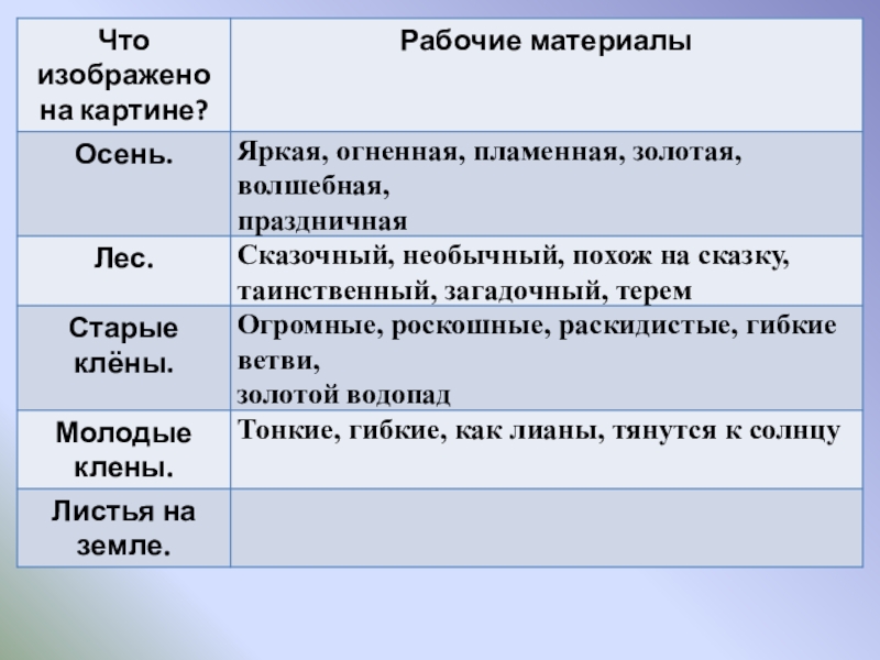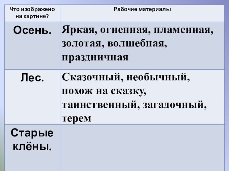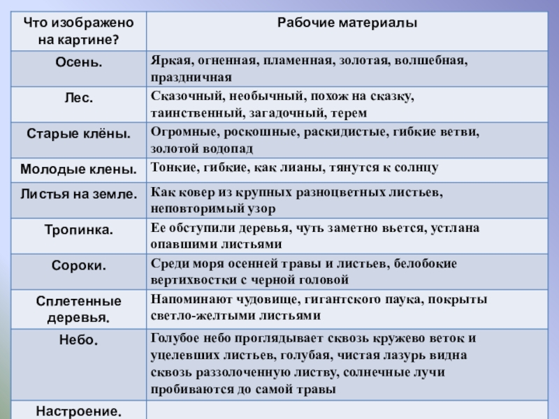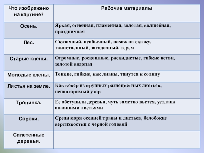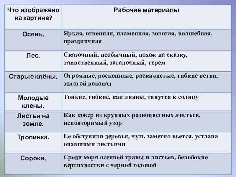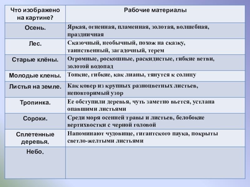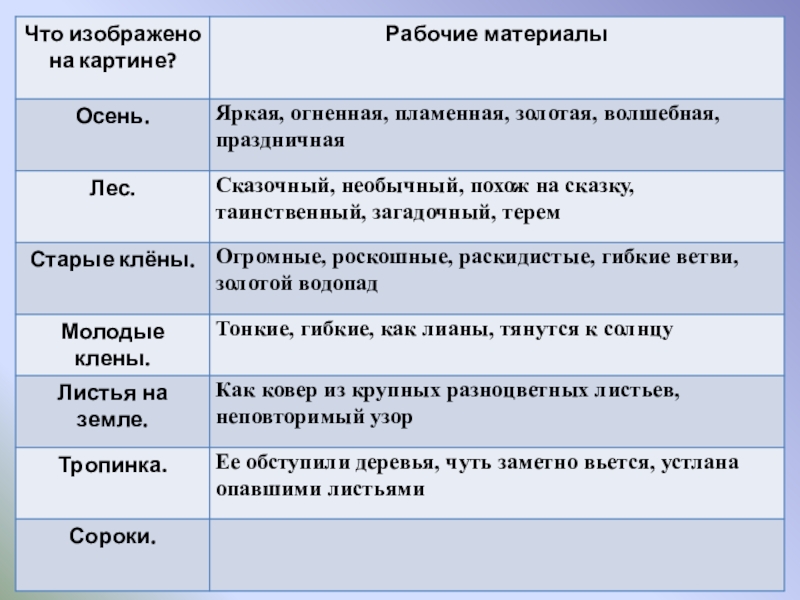 Цели урока: 1.   Обучающая: подготовить учащихся к написанию сочинения-описания  по картине, совершенствовать умение собирать рабочие материалы к сочинению.  2.   Развивающая: развивать устную и письменную речь учащихся, расширить активный словарь введением слов на тему "Осень".  3.   Воспитывающая: