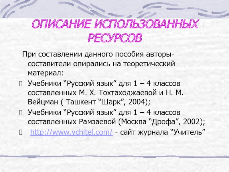Учебники “Русский язык” для 1 – 4 классов составленных М. Х. Тохтаходжаевой и Н. М. Вейцман ( Ташкент “Шарк”, 2004);
